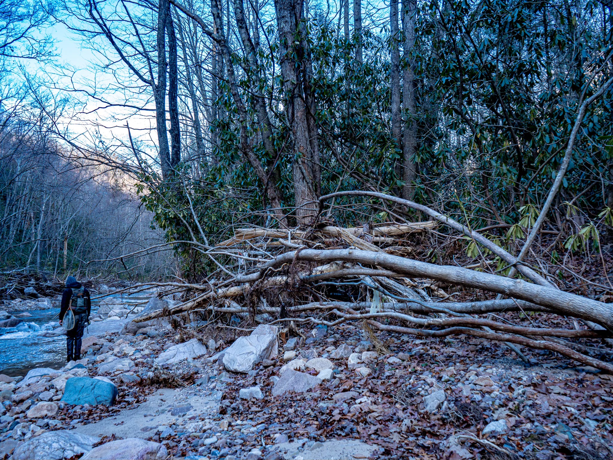 After his recount of the disaster, he began telling us about the dangers of what was in the stream, the endless debris, unmapped and unwalked sections of river, blown-out bridges, 35-degree water, and no cell reception were all things we had to take into account before we moved forward from here.