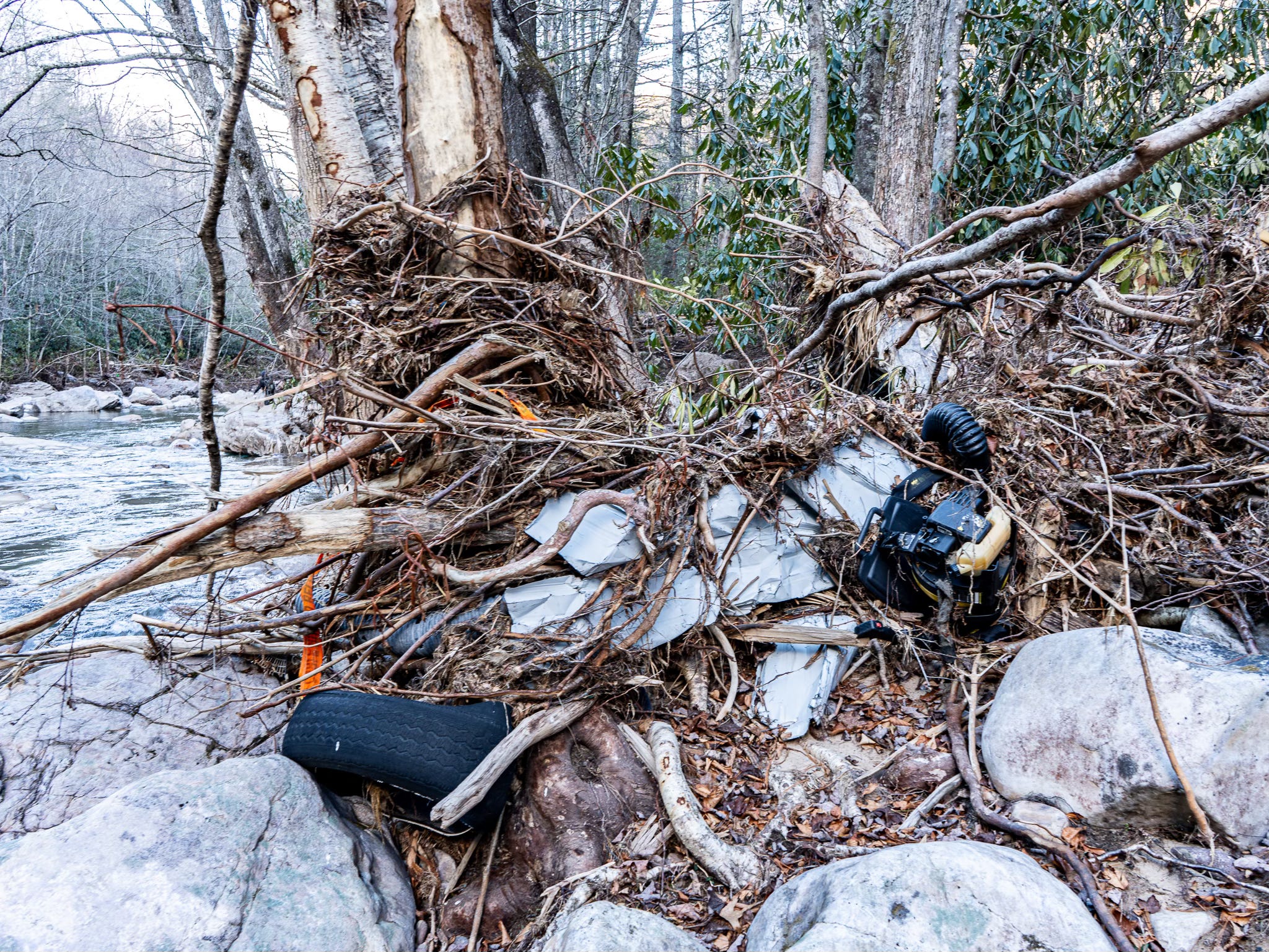 Pockets of trash washed up against the trees, approximately 200 feet from where the trail had washed out