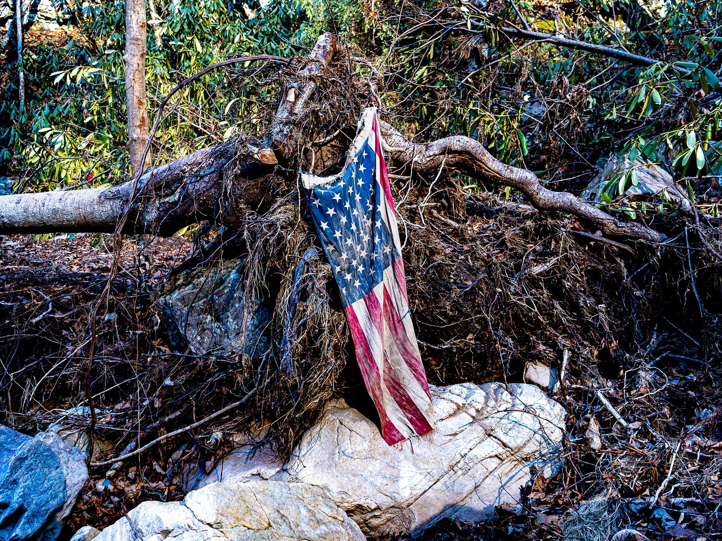 An American Flag, resting on the roots of a fallen tree next to the stream